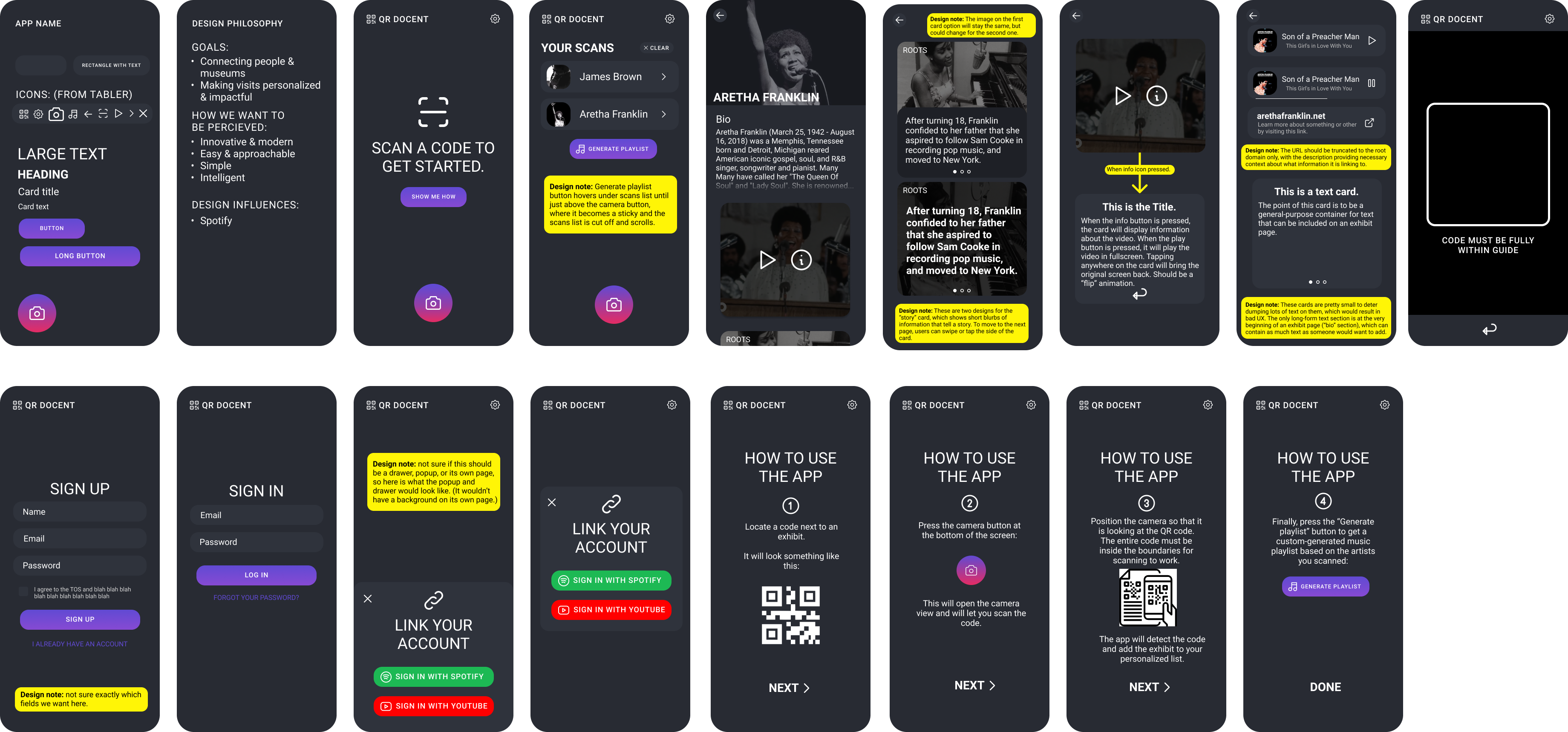 I started by creating a design philosophy for the project. Our team's overall goals for the project are to connect people and museums, and to make museum visits more personalized and impactful for visitors. With this in mind, I also defined how we want the app to be percieved: as modern and innovative as well as simple and approachable. We want people to view this app as easy to use and as a step forwards for interactive museum technology.